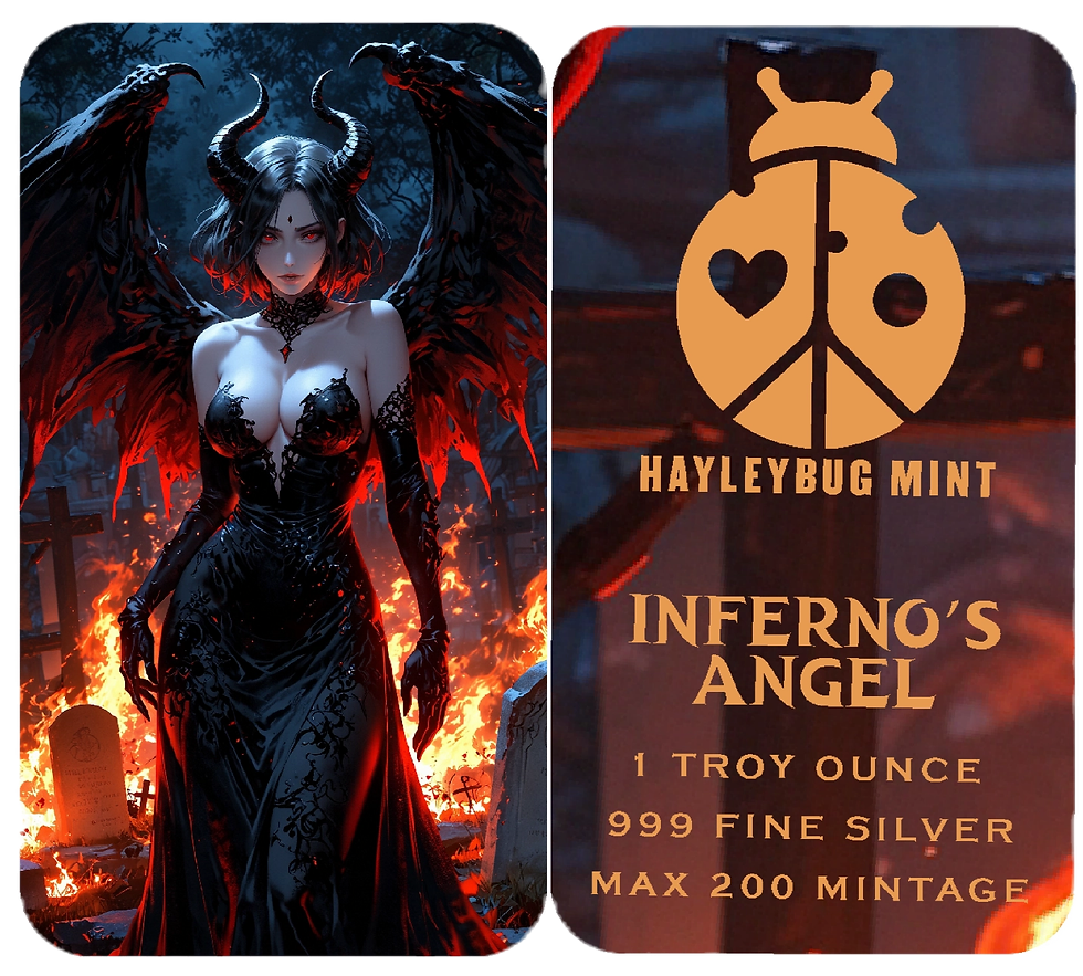 INFERNO'S ANGEL by Hayleybug Mint 1 Troy Ounce 999 Fine Silver Art Bar